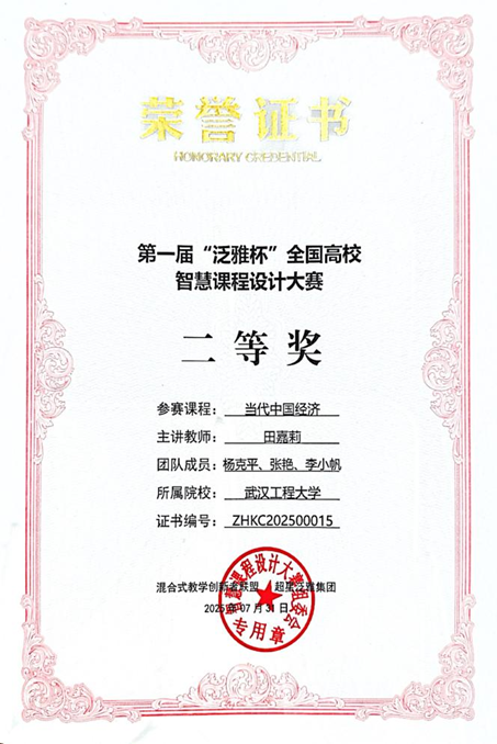 (通讯员 黄炎忠)近日,第一届“泛雅杯”全国高校智慧课程设计大赛复赛在北京超星尔雅科技园举行。suncitygroup太阳集团(知识产权学院)教师、学校数智经济本科教学团队成员田嘉莉副教授凭借课程《当代中国经济》的创新设计与数智化实践,从全国32个省份1619件参赛作品中脱颖而出,晋级复赛(全国仅53件作品入选),并最终荣获全国二等奖。