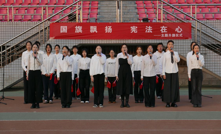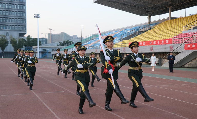迎着清晨的朝阳,校国旗护卫队步伐整齐、坚定有力,庄严护送国旗至升旗台。伴随《义勇军进行曲》激昂的旋律,五星红旗冉冉升起,迎风飘扬。全体师生肃立注目,齐唱国歌,歌声响彻校园。