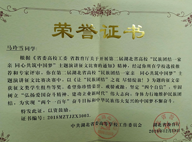 2018年12月28日,我校18级马玲雪同学在第二届湖北省高校“民族团结一家亲同心共筑中国梦”主题演讲征文比赛决赛中,以《让“民族团结”之花尽情绽放!》为题的征文荣获征文类学生组叁等奖。