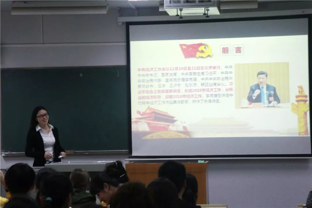 2019年4月15日,国贸教研室吴贤荣老师就2019年中央经济会议重要讲话内容在2017级经济学专业开展“课堂育人三分钟”活动。