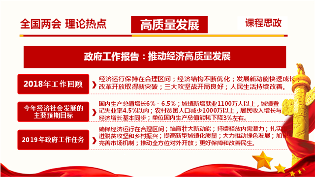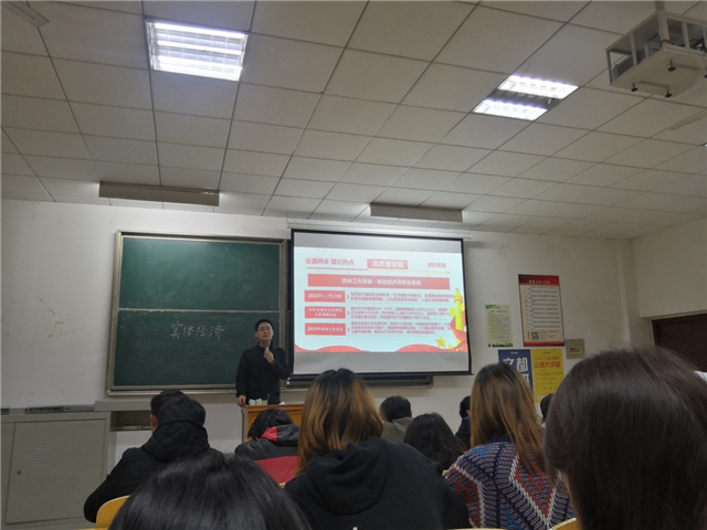 2019年3月19日,国际贸易教研室主任付传明老师针对全国两会精神的内容在2016级国际经济与贸易专业开展“课堂育人三分钟”活动,他简明扼要以政府工作报告的三项内容——2018年工作回顾,今年经济社会发展的预期目标,2019年政府工作任务进行讲解,结合“高质量发展”这个主题,对政府在今后推动高质量发展的问题上进行精准分析。同时,以政府工作报告的内容引出所教学的课程内容,思政教育的同时,很好的融合了专业教育。