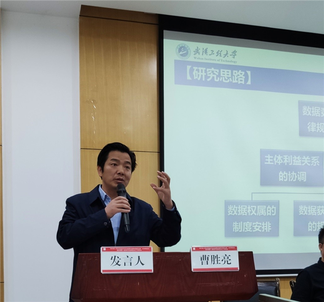 开幕式后的主题发言由武汉工程大学生态文明研究院院长、湖北省经济法学研究会副会长许承光教授与重庆大学张舫教授主持。主题发言阶段,湖北经济学院党委副书记刘大洪教授、重庆市民法经济法研究会、国际经济法研究会会长许明月教授、中南财经政法大学黎江虹教授、西南大学法学院阳雪雅副教授与武汉工程大学马克思主义学院院长曹胜亮教授依次就其论文作主题报告。曹胜亮教授以《人工智能时代数据竞争的法律规制》为主题,从融合了大数据与云计算的人工智能时代的研究背景出发,综合考量数据市场的各方利益关系,拟定“数据权属—数据获取与使用—数据控制”的规则框架。并运用竞争法相关的基本原理与研究思路对于数据权属的制度安排、数据获取与使用的规则建构、数据控制的界限设定等研究问题作出了富有建设性意义的回答。主题发言阶段的与谈人湖北经济学院法学院院长邱秋教授对论文及发言给予了高度评价。