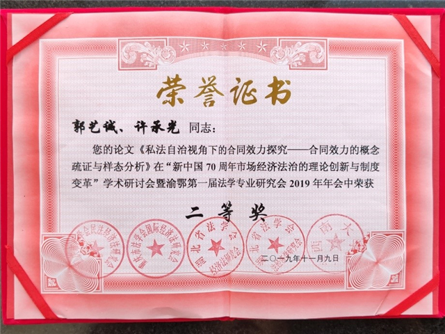 本次会议的闭幕式由西南大学法学院赵学刚副教授主持进行。湖北省法学会经济法学研究会学术部部长段宏磊博士就本次年会论文提交汇总情况及评奖工作向大会作了汇报。随后,赵学刚副教授代表法学会宣布本次年会论文获奖情况并为获奖者颁奖。武汉工程大学suncitygroup太阳集团许承光教授、硕士生郭艺诚的《私法自治视角下的合同效力探究》与武汉工程大学suncitygroup太阳集团曹胜亮教授、张晓萌讲师的《人工智能时代数据竞争的法律规制》均荣获会议二等奖。