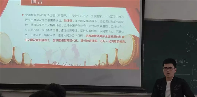 陶夏老师从全国教育大会的在思想上与实践上的意义入手,重点解读全国教育大会“5个人”的工作目标,阐述了9个坚持,明确1个根本任务,围绕1个目标,坚决克服5个唯,着重培养3种人才,本次活动,陶夏老师根据教育专业学生的求职要求,深入结合教育大会精神进行职业选择的引导,对学生未来针对教育职业有了新的认识,对提高职业素养有了很大的帮助。