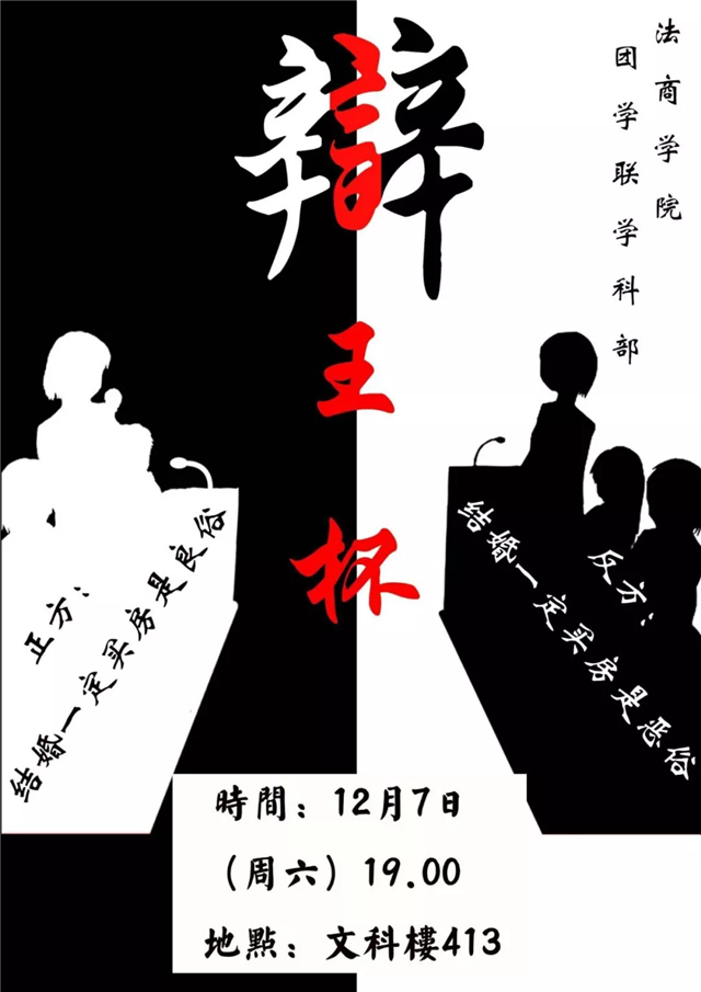 suncitygroup太阳集团一年一度的辩论赛就要开啦!!! 天气转凉,但是青春的气息依然火热。在这样的浪漫初冬,与并肩的同学一起进行思想的碰撞,智慧的延伸,给予大学生活浓墨重彩的一笔,又有何不可?期待两队8位选手精彩的交锋吗?他们的辩题是“结婚一定要买房,在当今是恶俗还是良俗”在雷敏、皮梦琪两位指导教练的带领下,究竟哪一方可以获得最终的胜利,捧起言王杯? 所以你还不心动吗?有朋友,有学分,有荣誉,有奖品,这样的辩论赛值得这样的你!
