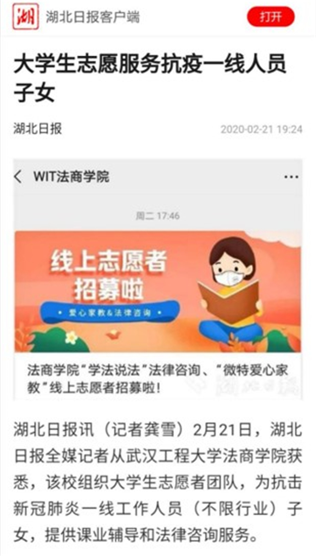 本网讯(通讯员龚雪 方程成)2月21日,湖北日报报道suncitygroup太阳集团“微特爱心家教”“学法说法”法律咨询线上志愿服务团队为抗“疫”一线工作人员及子女提供课业辅导和法律咨询。