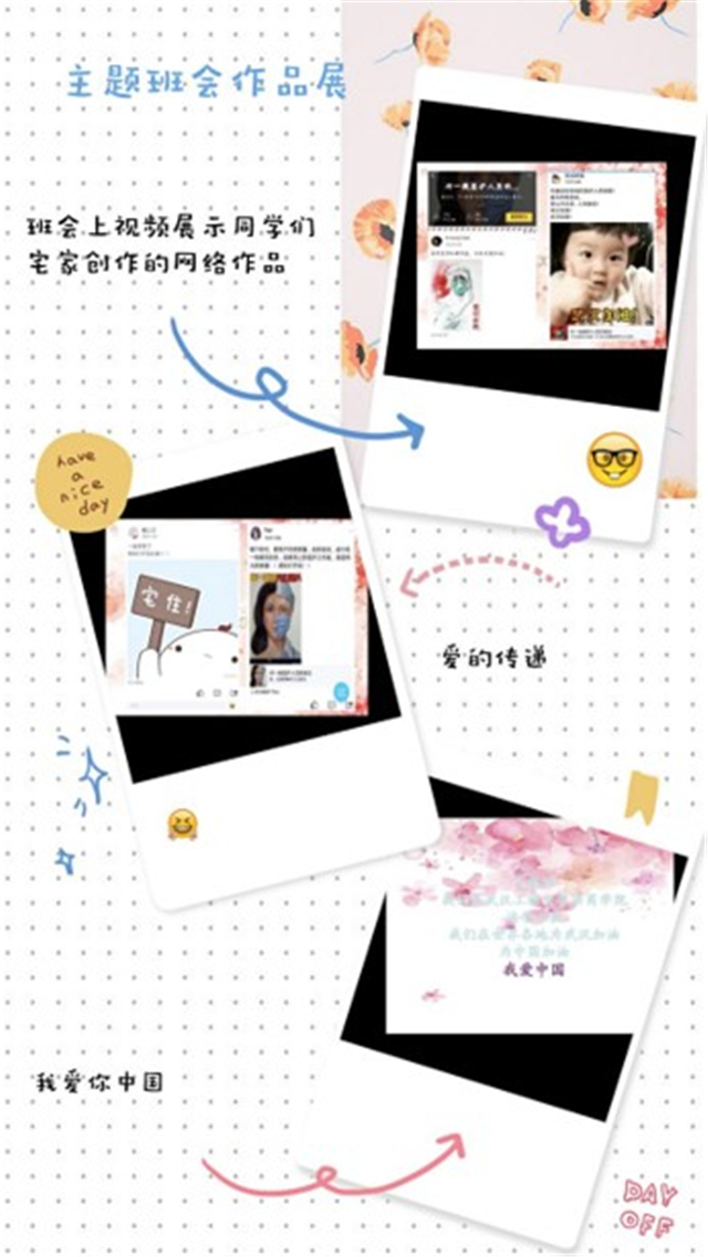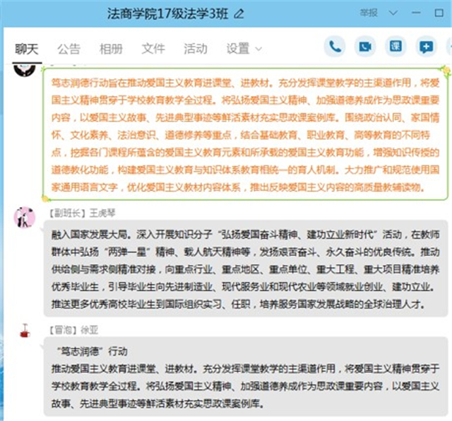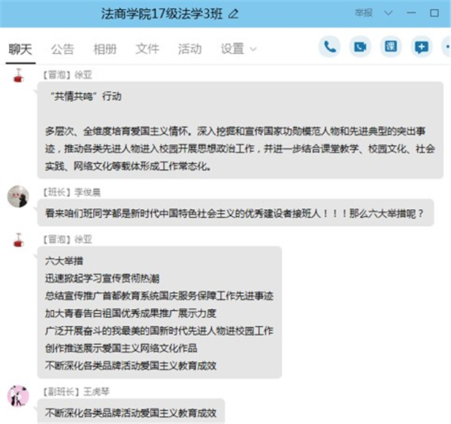 姬姝:非常感谢郑书记、王部长在百忙之中同我们一道相聚在网络平台、同我们一起讲述、分享我们的抗“疫”故事。疫情当前,学校领导和老师的一句暖心的话胜过一切。今天的活动上,同学们讲述家乡采取的防疫措施和防疫故事,平凡而伟大,无不凸显着国人的家国情怀。许多同学冒着被感染的危险挺身而出,在社区里做志愿者,他们是我们学习的榜样。对于现阶段网上授课的教学方式,相较于传统的模式有些区别,同学们分享的学习方法和学习资源对我们上网课很有帮助。此次班会我收获了很多。
