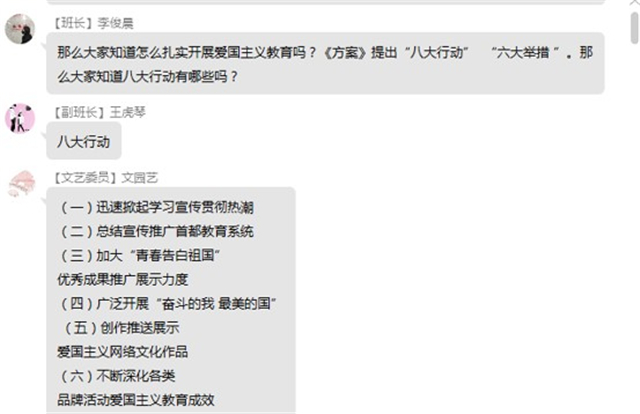 活动结束后,全体同学集体学习了《新时代爱国主义教育实施纲要》《教育系统关于学习宣传贯彻落实〈新时代爱国主义教育实施纲要〉的工作方案》,开展了“云唱”一首主题歌,写一封信给“疫情后的自己”等网络主题活动。