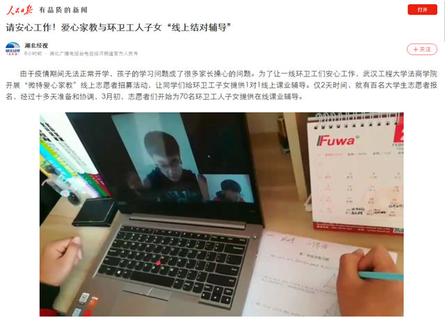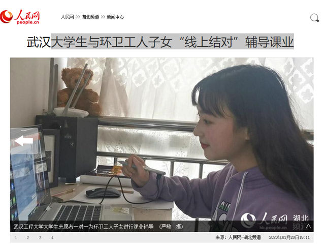人民网武汉3月20日电 武汉工程大学的百名大学生志愿者开始一对一为武汉环卫工人子女进行网上课业辅导,这70名环卫工子女主要是15个城区的抗击疫情一线的环卫突击队员以及一线环卫先模代表。