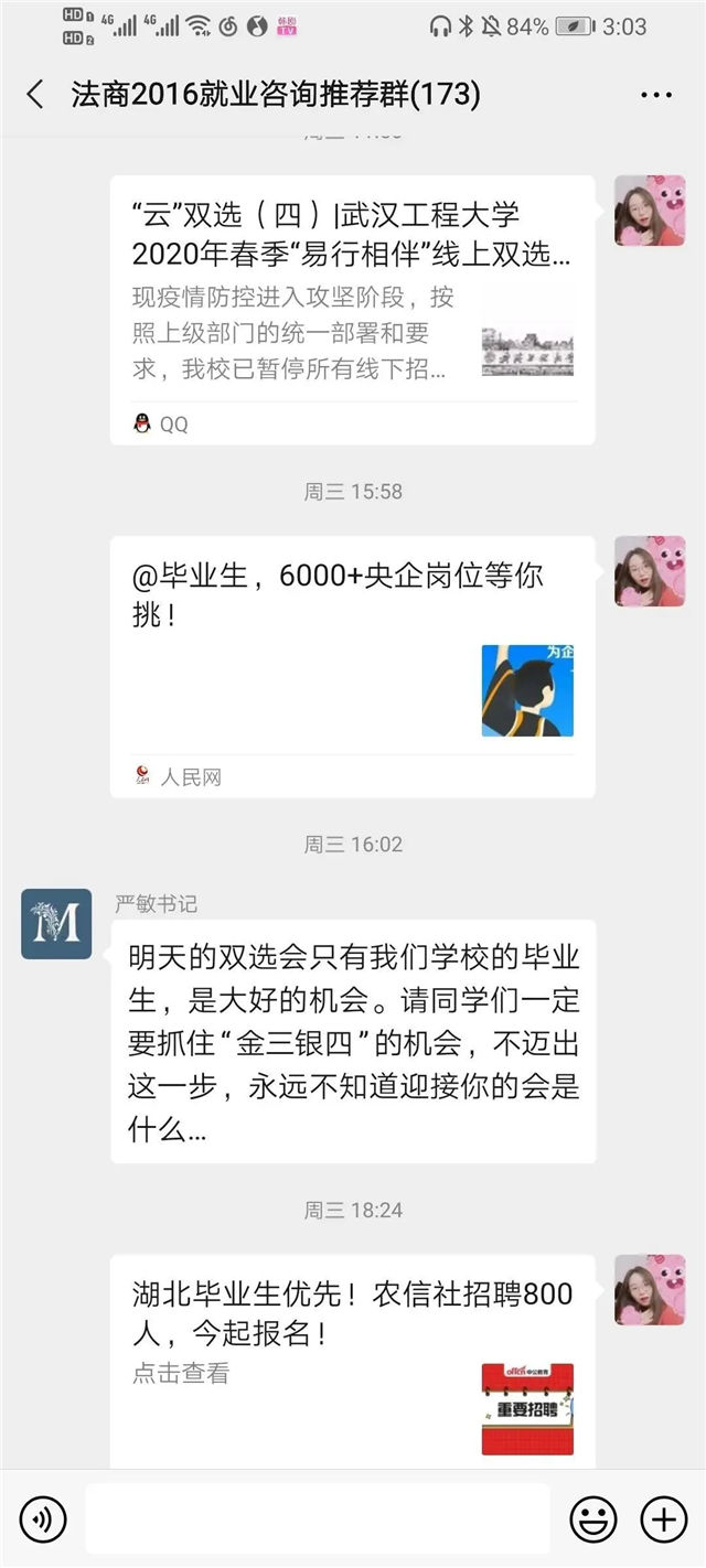 在守望相助、共克时艰的时刻,感谢各级领导、各职能部门、学院教师对法商学子的关心与关爱。学院将扬长避短,进一步加大线上毕业生就业指导与服务工作力度,加强特殊群体精准就业帮扶和指导力度,凝心聚力、共商共建,确保关爱“不下线”、就业“不断线”。预祝每一位毕业生在春花烂漫的时节逐梦青春、扬帆起航!