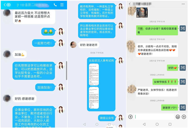 学院就业工作领导小组成员,多平台搜集就业信息,通过QQ群、微信群等精准推送就业招聘信息,鼓励学生抓住春招机遇,积极就业,目前已发布甄选后的各类招聘信息100余条。分享求职技巧、调剂信息、面试经验,对毕业生的职业选择、求职简历、面试技巧等给予指导,解答毕业生求职过程中的困惑。