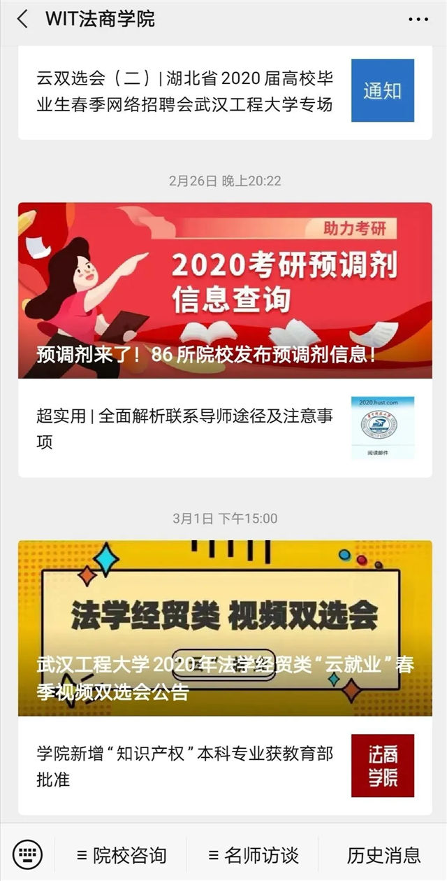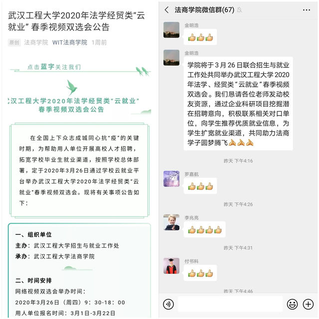 学院联合招生与就业工作处举办武汉工程大学2020年法学经贸类“云就业”春季视频双选会,大力宣传、主动出击邀请优质单位参加校园网络招聘会,做好网上招聘操作流程指导和就业单位审核,多方发力,保障学生就业“不打烊”。