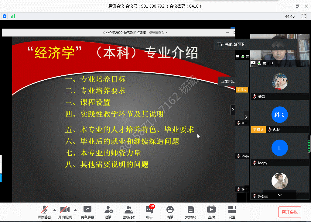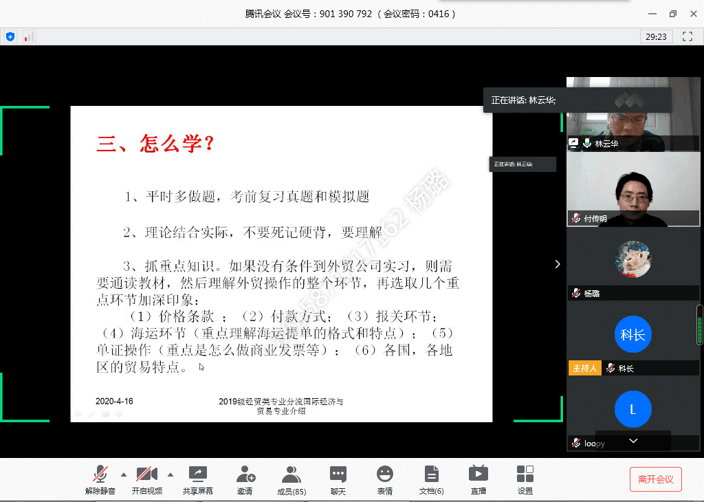 (通讯员:杨璐)疫情期间,为保证2019级本科学生专业分流工作的稳步推进,让各位同学对选报专业有更清楚的认识,suncitygroup太阳集团于4月16日下午通过腾讯会议平台组织开展了“2019级专业分流线上宣讲会”,suncitygroup太阳集团院长金明浩、副书记严敏、院长助理付书科、经济学教研室主任张艳、国际经济与贸易教研室主任付传明、经济学教研室韩可卫教授、国际经济与贸易教研室林云华、周灏教授、部分班主任和19级全体经贸大类同学参加了此次会议。