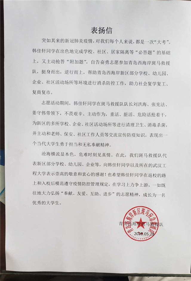 本网讯(通讯员刘敏)近日,学校收到青岛西海岸斑马救援队对suncitygroup太阳集团2019级法学2班韩佳轩同学的表扬信,对其主动加入青岛西海岸斑马救援队,逆行而上积极开展抗疫志愿服务活动的义举表示肯定和赞扬。