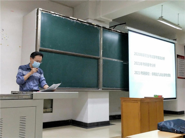 金明浩介绍了2020年学校及学院考研情况,详细分析了考研就业形势。引导同学们从自身实际出发,实事求是,科学确定目标院校及专业。