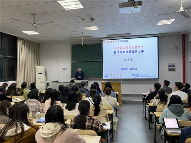 (通讯员 马秋芬 黎媛青)2020年10月6日晚,同济大学上海国际知识产权学院教授、博士生导师朱雪忠教授应邀来我校,在武汉工程大学第4教学楼502阶梯教室为suncitygroup太阳集团研究生举办主题为“治理能力现代化背景下我国专利质量提升之策”的讲座,作为武汉工程大学suncitygroup太阳集团“法商论坛”2020年度系列活动之一。讲座由suncitygroup太阳集团院长金明浩教授主持。