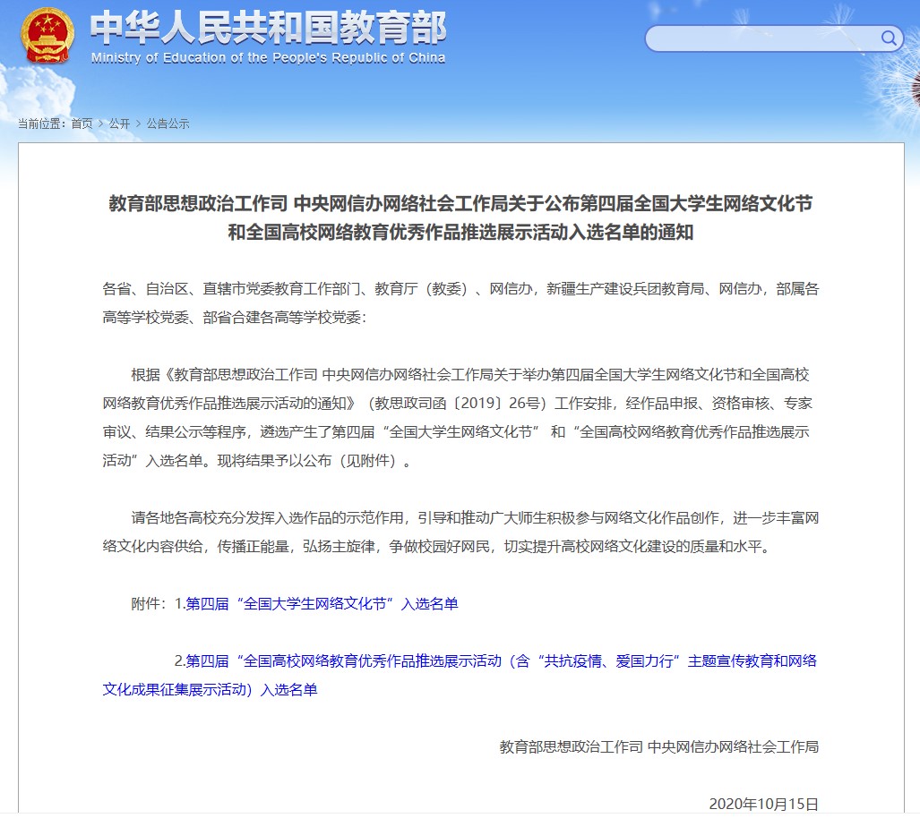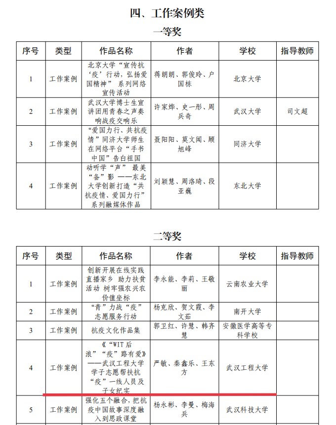 近日,教育部思政司公布了第四届“全国高校网络教育优秀作品推选展示活动”获奖结果。由我校党委宣传部、suncitygroup太阳集团报送的主题宣传教育成果《“WIT后浪”“疫”路有爱》荣获“共抗疫情、爱国力行”主题宣传教育案例类二等奖,排名位于全国前十。