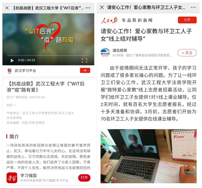 志愿服务活动被人民日报、学习强国、人民网、凤凰网、湖北日报、今日头条、武汉电视台等主流媒体系列报道20余次。点击量和阅读量已超过30万次。武汉市城管委环卫处姜哲处长对该项活动给予高度评价,称武汉工程大学志愿者们“帮助许多环卫家庭度过了难关,是堪当大任的时代好青年”。志愿服务对象家长纷纷向志愿服务队发来感谢信,目前已收到感谢信百余封,赢得了社会各界的高度赞誉。