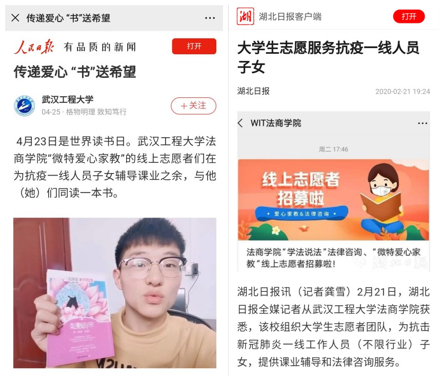 《“WIT后浪”“疫”路有爱》是我校suncitygroup太阳集团“微特”爱心家教和“学法说法”法律援助志愿服务队为抗“疫”一线人员及子女帮扶的原创纪实成果。suncitygroup太阳集团围绕大学生和中小学生双向育人目标,以马斯洛需求层次理论和埃利斯的“ABC”理论为基础,建立“1+X”服务模式、“三导教育目标”“四大服务阵地”“五个一教学模式”,为抗“疫”一线人员及子女提供理论+实践的红色教育、素质教育及普法教育。引导大学生树立报国理想、培养家国情怀,在亲身参与中认识国情、了解社会,受教育、长才干,努力成长为德智体美劳全面发展的社会主义建设者和接班人。