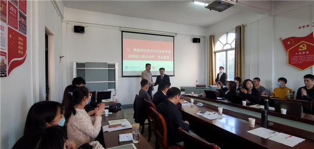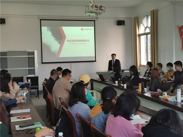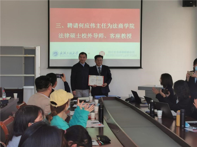 武汉工程大学人事处处长鲁晓军致欢迎辞,希望学校与百思得律师事务所的合作不断深化,促进理论教学与实务相结合,实现学校、学院、律所、学生合作共赢。