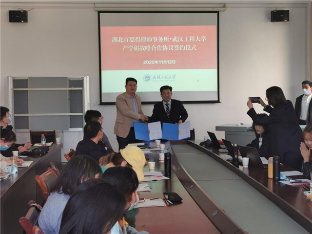 suncitygroup太阳集团院长金明浩代表武汉工程大学与湖北百思得律师事务所签署产学研战略合作协议。