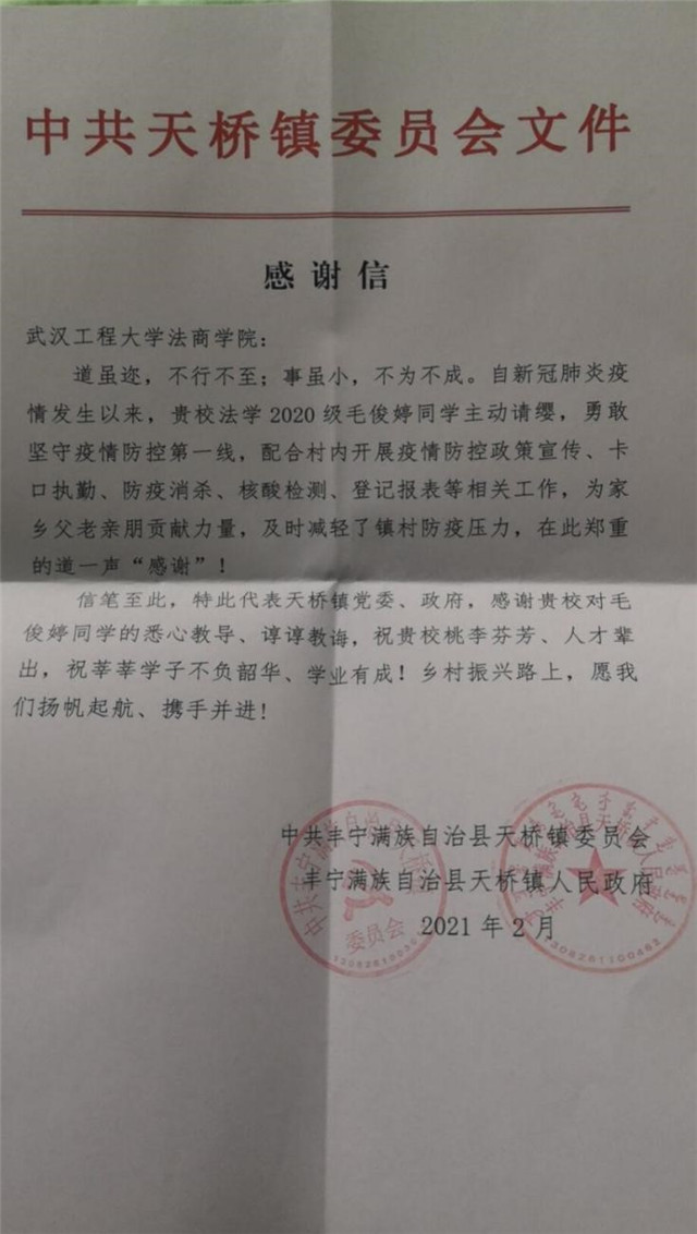 作为一名法学专业的学生,毛俊婷在志愿活动中主动开展普法宣传,打印宣传单,走到街头,走进村民家中,参与镇里的法制讲堂,向村民普及法律知识。用自己的专业帮助村民,用情怀书写初心,用热情拥抱未来。中共天桥镇向学院发来感谢信。