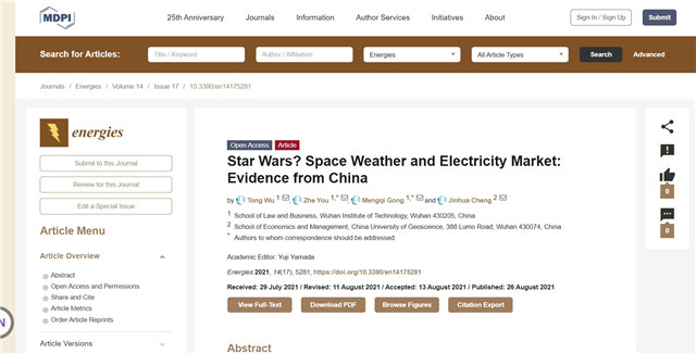 本网讯(通讯员 尤喆)近日,我院2018级本科生吴桐同学在我院青年教师付书科、尤喆,龚梦琪和中国地质大学(武汉)成金华等多名老师共同指导下,完成一篇题为“Star Wars? Space weather and electricity market: Evidence from China”的科研论文,并顺利发表在能源经济领域SCI期刊《Energies》上。本论文第一作者为本科生吴桐,通讯作者为尤喆老师。