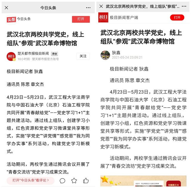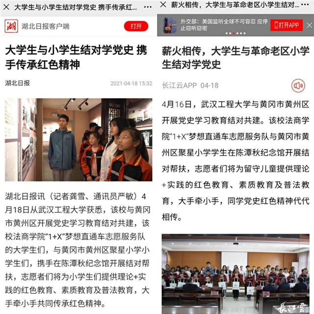 团支部创新“百生讲坛学‘习’”形式,线上线下青年大学习率达100%。支部与中国石油大学的同学们携手云参观历史博物馆,聚焦两会学党史、云端传书守初心。邀请老红军康正坤后代薛康与支部同学同上党史教育课,走进抗美援朝老战士胡礼清的家中,聆听胡老师抗美援朝的故事。为铸牢中华民族共同体意识,支部创新“双语学党史,搭起民族团结连心桥”活动,支部成员与学院少数民族同学“1+1”结对互助促团结。支部学习活动被人民日报、湖北日报等主流媒体聚焦报道20余次。