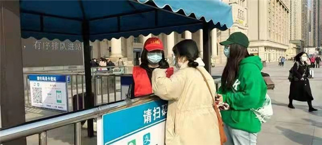我院21级经济与贸易类专业张悦颖同学积极参加汉口火车站“党团先锋”志愿服务活动,协助车站工作人员维护秩序,帮助老年人开通健康码和行程码,提醒广大乘客佩戴好口罩。张悦颖说:在疫情面前,没有人能够独善其身,作为青年学生更应该贡献自己的一份力量,把我们的祖国建设得更加美好。