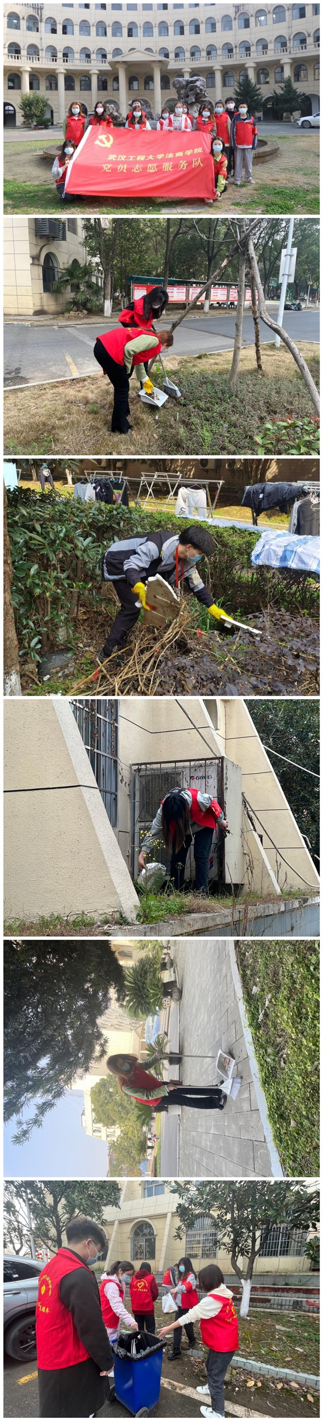 党员志愿服务队将践行雷锋精神与开展劳动教育相结合,组织全体志愿者携带工具,奔赴各自岗位,帮助清理责任区的垃圾,清扫学校道路,将树枝、树叶、垃圾统一收装,并向同学们宣传雷锋精神、号召大家共同开展劳动,维护学校环境。