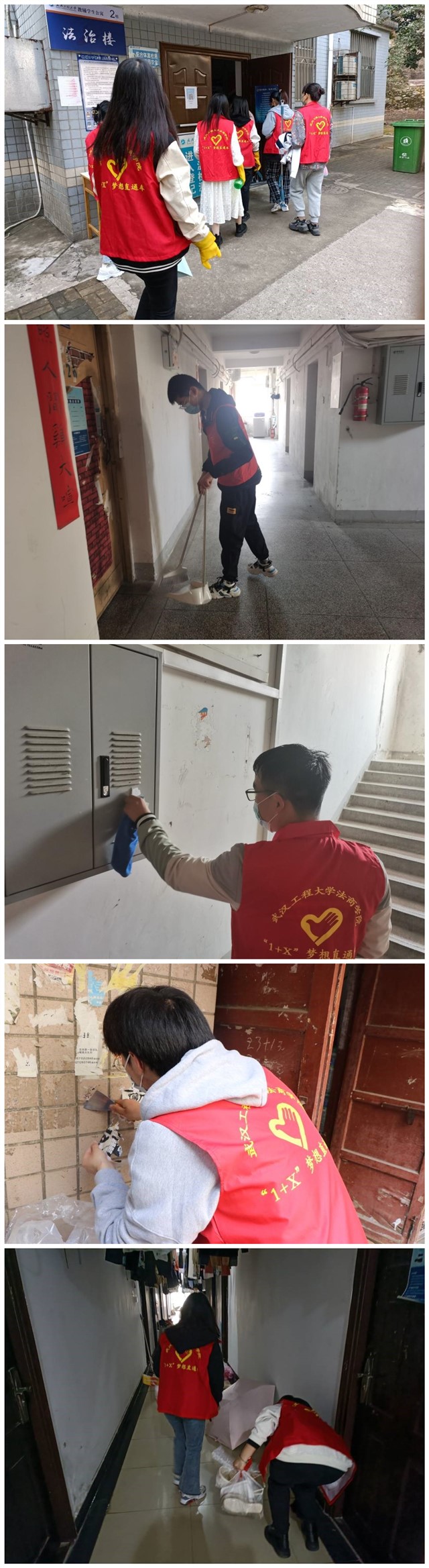“1+X”梦想直通车志愿服务队前往教辅、泰塑学生公寓打扫宿舍楼道、清理垃圾。志愿者们按照事先的统一安排,各司其职,以行动为表率,不怕脏、不怕累、不偷懒,井然有序的开展打扫活动,确保不留死角,不留盲区。