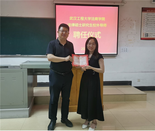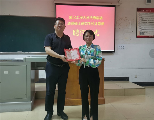 为进一步实现学科专业稳步发展,提高知识产权人才培养质量,武汉工程大学suncitygroup太阳集团聘请陈松梅主管和彭丽经理为法律硕士研究生校外导师,金明浩教授为陈松梅主管和彭丽经理颁发聘书。
