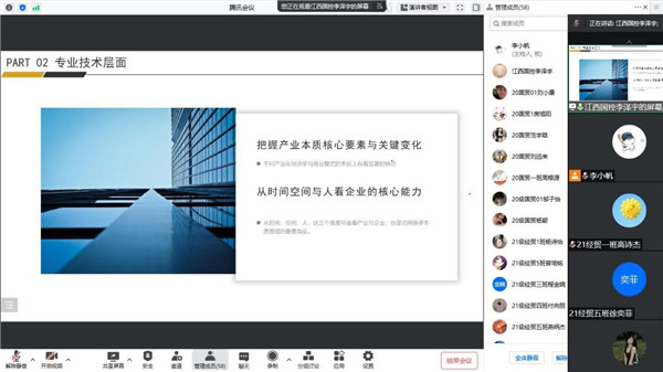 江西省国有资本运营控股集团有限公司投资发展部高级项目经理李泽宇从初识投资、专业技术层面和心理层面三个方面,为学生带来线上讲座《企业投资评估——关于投资的几点思考》。