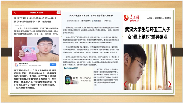 团队被人民日报、人民网、学习强国、凤凰网、湖北日报、武汉电视台、今日头条等主流媒体系列报道30余次,点击量和阅读量已超过30万次,收到感谢信百余封,赢得了社会各界的高度赞誉。