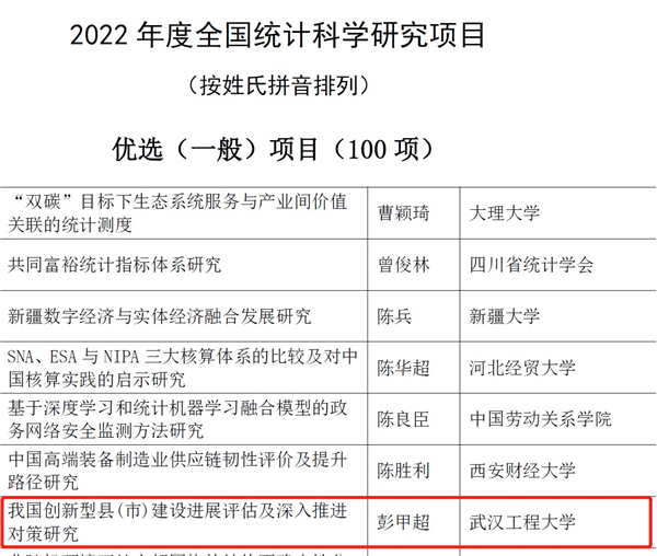 本网讯(通讯员 田嘉莉)近日,国家统计局发布了《2022年度全国统计科学研究项目立项公示》。我校suncitygroup太阳集团资源环境与高质量发展研究中心团队成员、青年教师彭甲超的“我国创新型县(市)建设进展评估及深入推进对策研究”,获批优选(一般)项目。