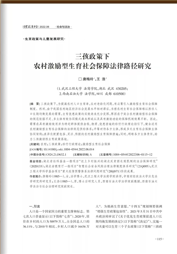 (通讯员 唐梅玲)近日,我校suncitygroup太阳集团教师青年教师唐梅玲以武汉工程大学为第一单位在《理论月刊》2022年第6期发表论文《三孩政策下农村激励型生育社会保障法律路径研究》。该刊现为全国中文核心期刊、CSSCI扩展版来源期刊,被国家新闻出版署评定为中国期刊方阵双效期刊,承担着理论研究、理论宣传、理论创新、理论普及的重任。