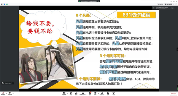 余华兵老师首先通报了近期武汉地区高校发生的诈骗事件,随后,他详细讲解了诈骗的危害、常见诈骗套路以及防诈反诈策略,并结合反诈短视频重点介绍了网络贷款、网络游戏装备、刷单返利、冒充“公检法”、交友诈骗等常见的电信网络诈骗手段,告诫大家要时刻提高安全防范意识,进一步加深同学们对电信网络诈骗手段的认识。最后,余老师总结了“831”防诈秘籍,希望同学们做到“给钱不要,要钱不给”,切实提高防诈反诈能力。