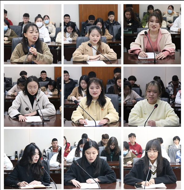9名学生干部代表分别从学习生活经历、担任学生干部的成长收获、寒假期间的所见所闻所感、就业备考的经历经验等方面进行了交流发言。
