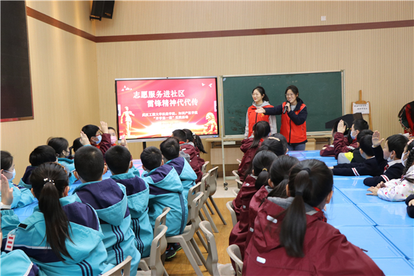 本网讯(通讯员 廖宜心、王祥礼)今年是毛泽东等老一辈革命家为雷锋同志题词60周年,为深入贯彻习近平总书记关于雷锋志愿服务的重要指示精神,深刻把握雷锋精神的时代内涵,进一步弘扬“奉献、友爱、互助、进步”的志愿精神,在实践中上好大学生“开学第一课”,3月3日上午,suncitygroup太阳集团(知识产权学院)与学校研究生院结对,联合武汉市洪山区梨园街东湖社区、洪山区梨园小学开展“志愿服务进社区 雷锋精神代代传”“开学第一课”实践活动。研究生院团委指导老师李茜、学院团委指导老师章文杰、辅导员刘敏、王祥礼、宋佳丽、15名志愿者和东湖社区工作人员、梨园小学40余名师生参加活动。