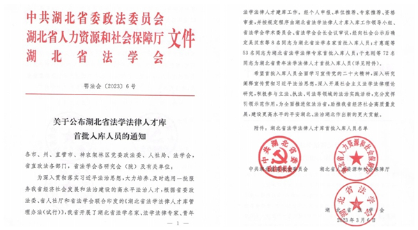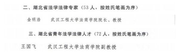 据悉,2021年5月,湖北省法学会根据湖北省委政法委、省人社厅和省法学会《关于印发<湖北省法学法律人才库管理办法(试行)>的通知》要求,面向全省立法、执法、司法等部门和省内相关高等院校、科研单位从事法学研究和法治实务工作的人员,组织开展了湖北省法学法律人才库入库人选申报工作。湖北省法学法律人才库由法学名家、法学法律专家、青年法学法律人才三个人才库组成,每类人才库均有严格的遴选入库条件。经过湖北省法学会学术委员会组织审评、公示,共有133名理论界、实务界的人士正式入选。其中,湖北省法学名家8人、湖北省法学法律专家53人、湖北省青年法学法律人才72人。另外,2021年12月,我校金明浩教授、汪沂副教授、王国飞副教授首批入选了武汉市法学法律人才库。