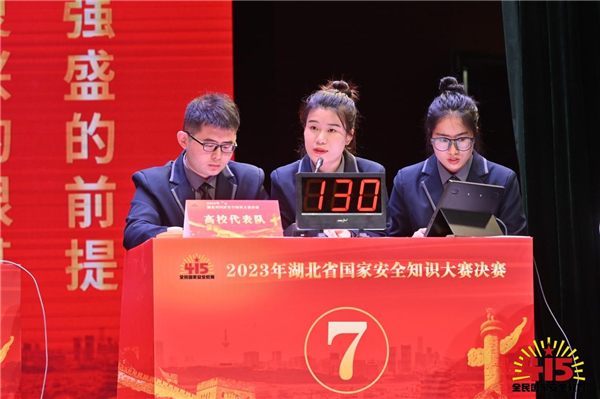 本网讯(通讯员 章文杰)4月14日,以“贯彻总体国家安全观,增强全民国家安全意识和素养,夯实以新安全格局保障新发展格局的社会基础”为主题的2023年湖北省国家安全知识大赛决赛在湖北省图书馆举行。本次湖北省国家安全知识大赛由湖北省委宣传部、湖北省委国家安全委员会办公室、湖北省国家安全厅、湖北省文化和旅游厅、湖北省国家保密局和湖北广播电视台主办。校党委副书记李志旭、党委学生工作部部长吕容涛以及50余名师生代表参加本次活动。