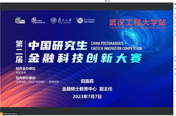 (通讯员 宋佳丽)为推动金融科技领域创新人才培养,提升金融专业学位研究生的实践创新能力,7月7日,学院金融硕士(MF)教育中心组织召开研究生金融科技创新大赛线上动员会。suncitygroup太阳集团(知识产权学院)副院长付书科,金融硕士(MF)教育中心副主任田嘉莉,研究生辅导员宋佳丽,suncitygroup太阳集团(知识产权学院)、管理学院和计算机科学与工程学院近百名硕士研究生参加此次动员会。会议由副院长付书科主持。