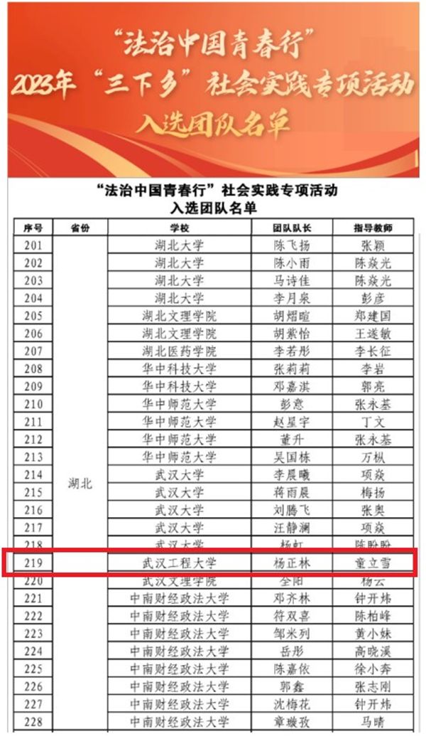 学院在近640名法学专业学生中精心挑选出16名同学组成普法宣传实践团,并为团队配备2名指导老师,在前期的周密策划、精心组织和学校团委的大力推荐下,实践团成功入选“法治中国青春行”全国大学生暑期社会实践专项活动团队,学院充分发挥学科专业优势,通过前往湖北、贵州等多地开展专题调研、普法宣传、人物采访、趣味实践等活动,寻找身边践行习近平法治思想的人物典型,不断创新法治宣传教育形式,推动法治教育与法治实践的深度融合,引导和帮助广大青年学生在与现实相结合的“大思政课”中为中国特色社会主义法治国家建设贡献青春力量。