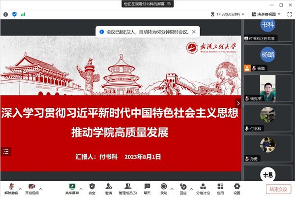 8月1日,学院副院长付书科以《深入学习贯彻习近平新时代中国特色社会主义思想 推动学院高质量发展》为题,为办公室党支部全体党员讲授专题党课。付书科从党的十八大以来党内集中教育的主要成就与宝贵经验、开展本次主题教育的时代背景和重大意义、把党的创新理论运用到贯彻落实党的二十大提出的重大战略部署中去、将主题教育学习成果转化为推动学院高质量发展的生动实践四个方面进行了详细阐述,并结合分管工作今年重点任务清单同参会教师开展热烈讨论,力求学院科研实力实现新突破。