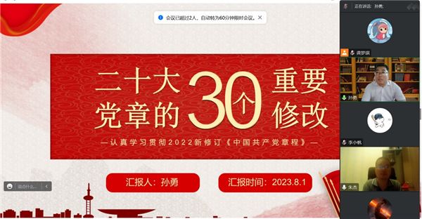 8月1日,学院党委副书记孙勇以《二十大党章的30个重要修改》为题,为国贸教研室全体党员讲授专题党课。孙勇从中国共产党章程基本概述、党的二十大修改党章的重要意义、党的二十大关于党章(修正案)决议、二十大党章的30个重要修改四个方面进行讲授,鼓励大家将理论学习与工作实践紧密结合。