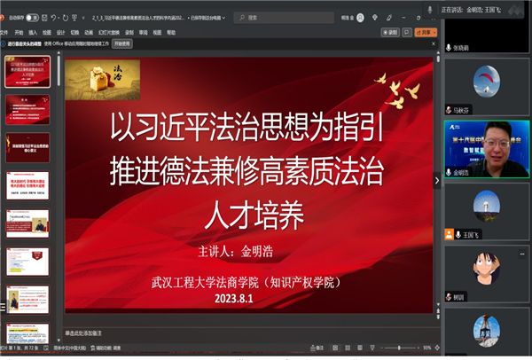 8月1日,学院院长金明浩以《以习近平法治思想为指引 推进德法兼修高素质法治人才培养》为题,为知识产权教研室党支部全体教师讲授专题党课。金明浩从历史、功能的角度系统解读了习近平法治思想的提出与发展、重要地位与核心要义,结合习近平总书记关于法治人才培养系列重要论述深刻阐释了培养德法兼修高素质法治人才是习近平法治思想的重要内容,并着重从法治人才培养的新使命、新目标、新模式、新机制、新格局方面深刻剖析了德法兼修高素质法治人才培养的科学体系,全面梳理回顾了学院在德法兼修高素质法治人才培养方面的实践探索经验,并同与会教师共同探讨交流。