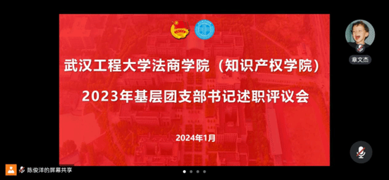 本网讯(通讯员 王颖)2024年1月17日下午3:00,suncitygroup太阳集团(知识产权学院)以线上腾讯会议的形式召开2023年度基层团支部书记述职大会,学院团委书记章文杰、2023级本科生辅导员王颖以及来自各年级的42名团支书参加会议。会议由章文杰主持。