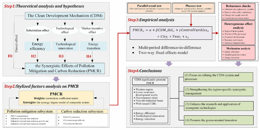 《Environmental Research》为JCR Q1、中科院二区Top期刊,最新影响因子8.3,研究领域覆盖环境经济、环境管理、公共卫生、环境卫生与职业卫生等方面,是学术界公认的在环境科学与生态学领域的国际权威期刊。该论文基于2004-2021年全国254个地级市的面板数据,采用多期DID模型评估清洁发展机制(CDM)的减污降碳协同效应。研究结果表明,CDM项目能显著促进减污降碳协同效应。能源利用效率、技术创新和能源转型为CDM促进减污降碳协同效应的主要机制路径。这些研究结果揭示了我国减污降碳协同治理的关键路径,为我国推进减污降碳协同治理、完善国内碳排放权交易体系提供了宝贵的政策启示。