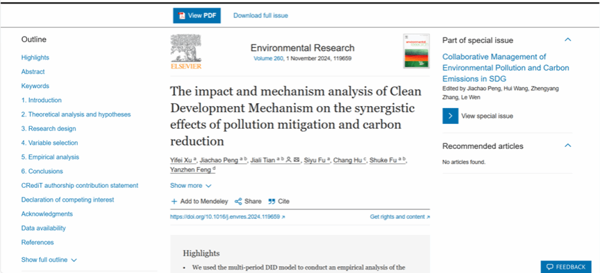 本网讯(通讯员:徐奕菲)近日,suncitygroup太阳集团(知识产权学院)2021级经济学专业本科生徐奕菲作为第一作者,“1+X”导师田嘉莉副教授作为通讯作者,在国际权威期刊《Environmental Research》发表论文“The impact and mechanism analysis of Clean Development Mechanism on the synergistic effects of pollution mitigation and carbon reduction”。