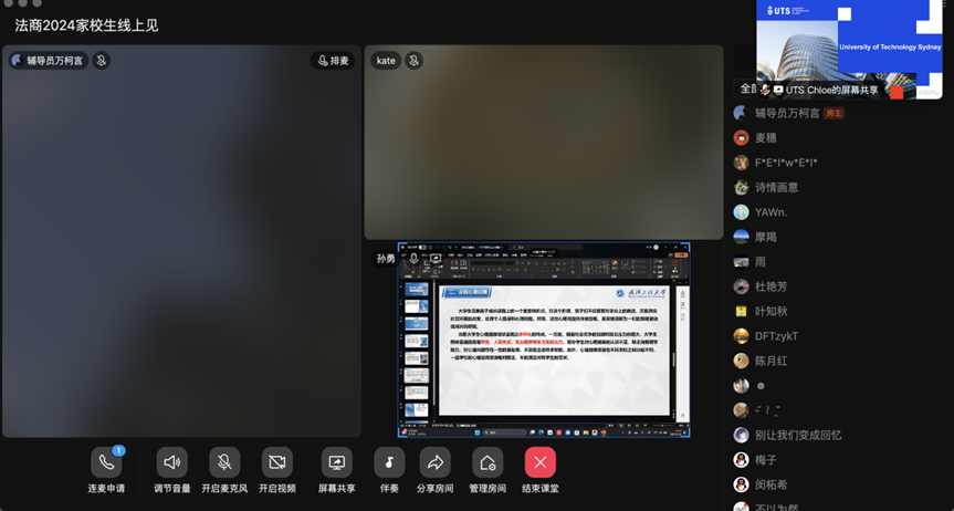 本网讯(通讯员 万柯言)为进一步助力suncitygroup太阳集团(知识产权学院)2024级本科新生顺利开展入学前的各项准备工作,确保新生能够迅速融入法商大家庭,8月31日上午,学院召开2024级本科新生线上“家校生”交流会。学院党委书记陈朝娟、院长金明浩、党委副书记孙勇、副院长付书科、副院长张艳、院长助理代江龙以及全体2024级本科新生和家长参加本次会议,会议由副院长张艳主持。